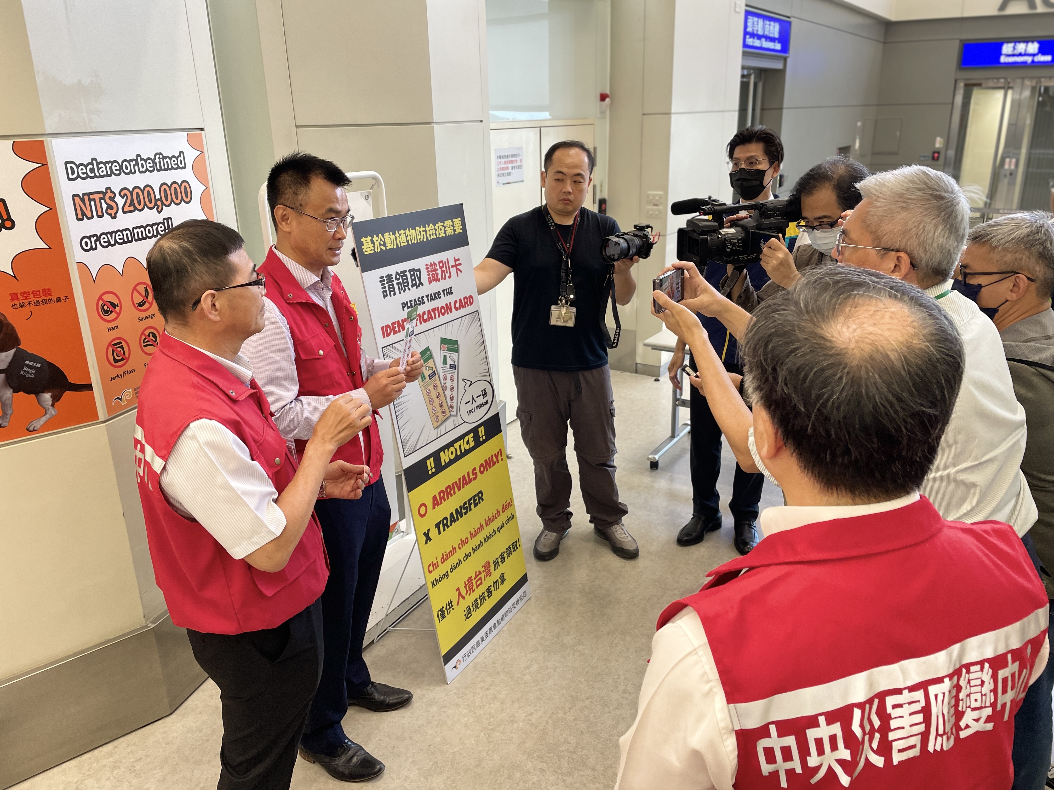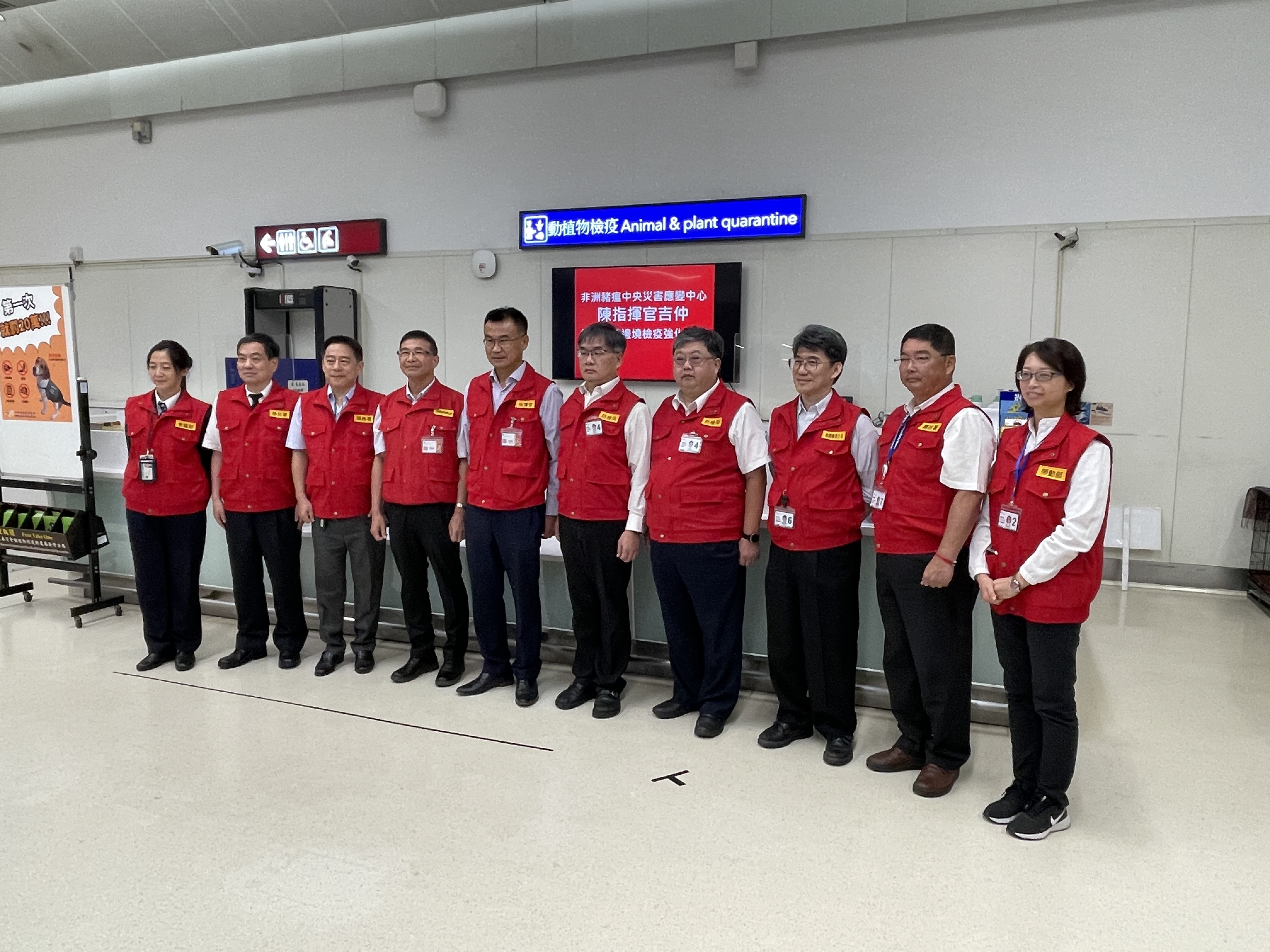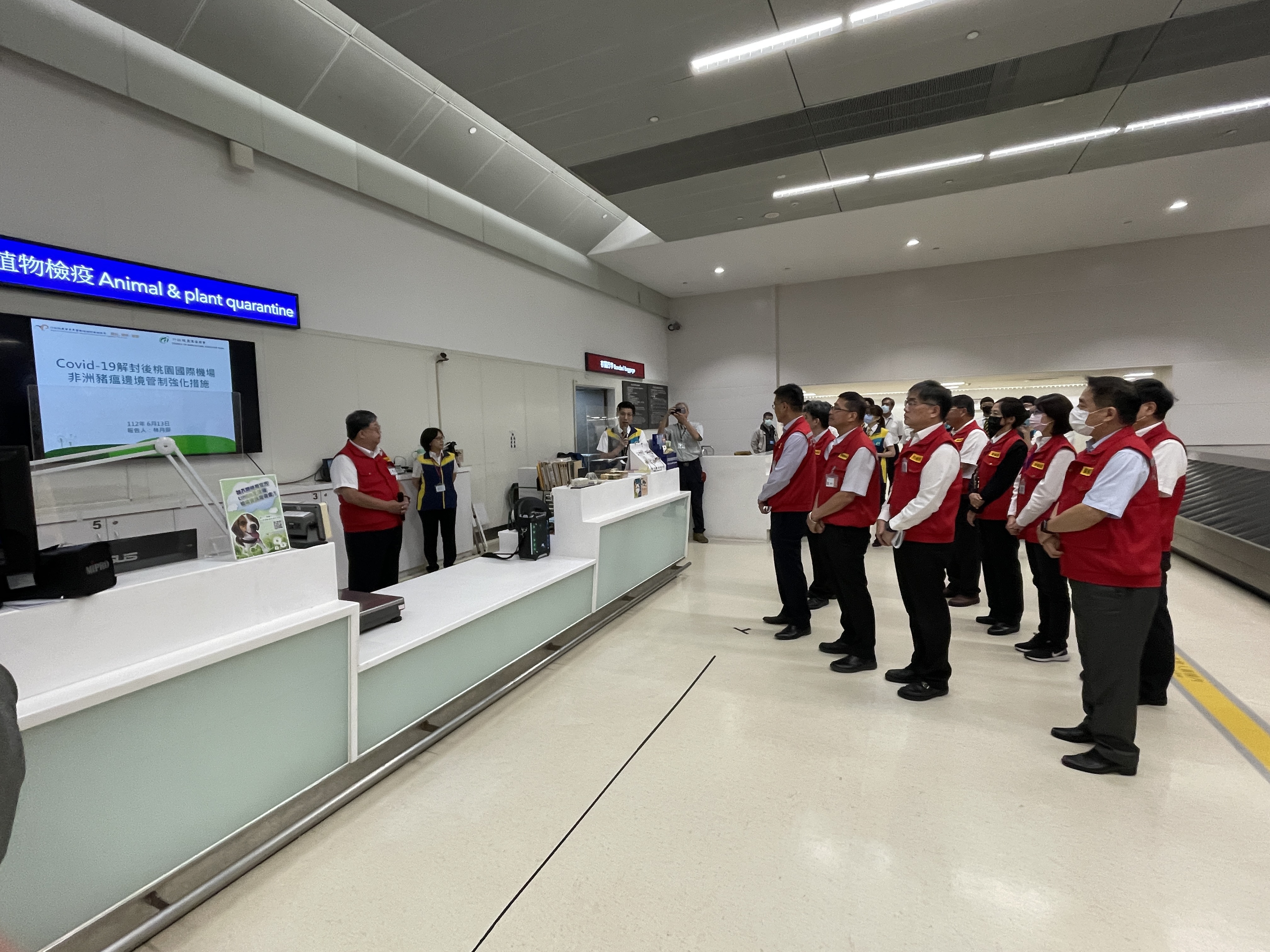 非洲豬瘟中央災害應變中心(下稱應變中心)指揮官農委會主任委員陳吉仲今天前往桃園國際機場視察邊境檢疫業務,近年來由桃園機場入境旅客數佔總入境人數8成,桃園機場的邊境檢疫工作可謂重中之重,陳指揮官實地督導邊境單位綠線加強執法與宣導情形,面對即將到來的端午連假和暑假出國人潮,陳指揮官特別提醒在邊境值勤的財政部關務署、內政部移民署、警政署及農委會防檢局等邊境管制機關同仁,面對即將到來的入境旅客高峰及疫病風險,絕不可掉以輕心,務必落實執行各項管制措施,防杜疫情於境外。
